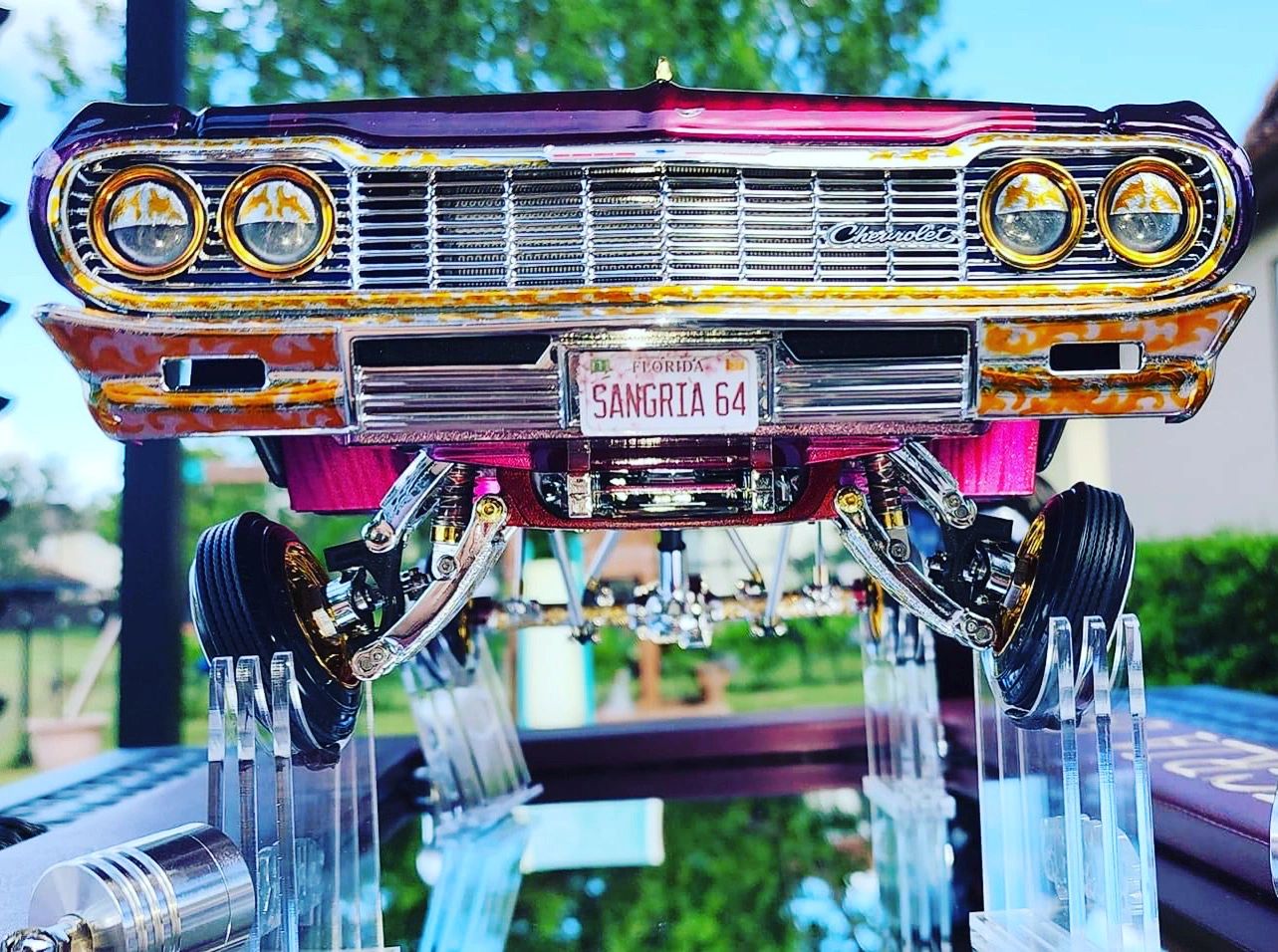 Sangria 64 owned by Rene Torres of Torres Family C.C. represented its amazing Kolors under the high quality indoor lighting. House of Kolor Kandys shine so bright. Amazing details on this Ride. kustom lowrider redcat lowrider redact racing